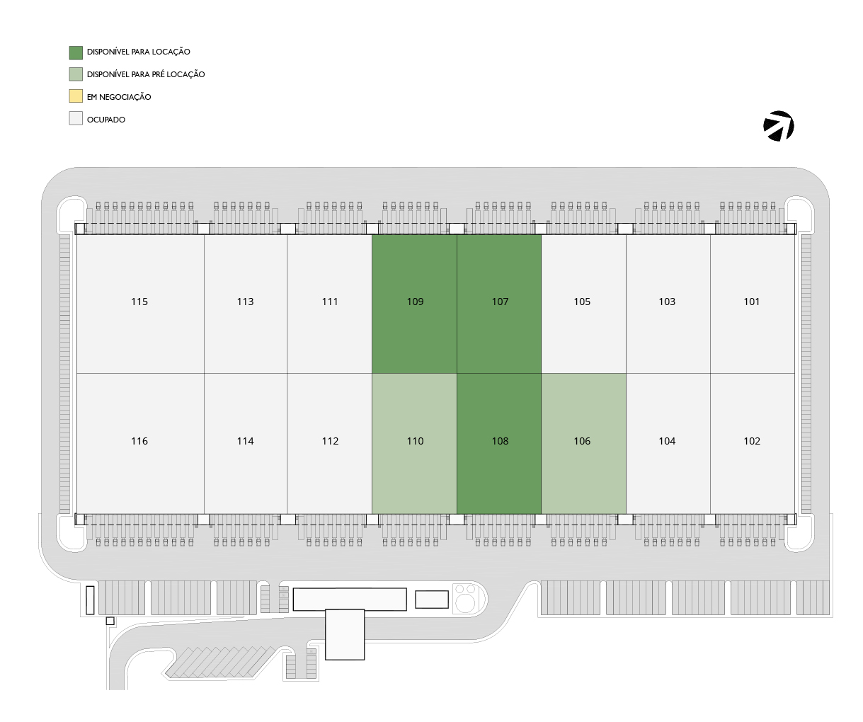 The areas marked in green are modules AVAILABLE for rental.